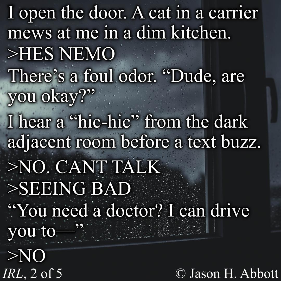 I hear a “hic-hic” from the dark adjacent room before a text buzz.