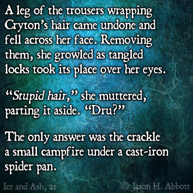 A leg of the trousers wrapping Cryton’s hair came undone and fell across her face. Removing them, she growled as tangled locks took its place over her eyes.