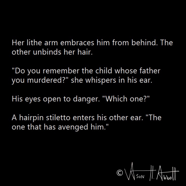“Do you remember the child whose father you murdered?” she whispers in his ear.