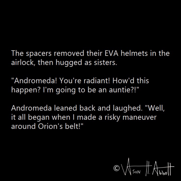 “Andromeda! You’re radiant! How’d this happen? I’m going to be an auntie?!”