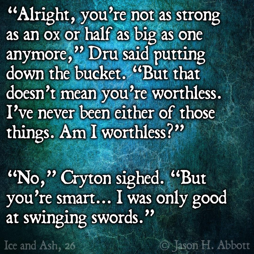 “Alright, you’re not as strong as an ox or half as big as one anymore,” Dru said putting down the bucket. “But that doesn’t mean you’re worthless. I’ve never been either of those things. Am I worthless?”