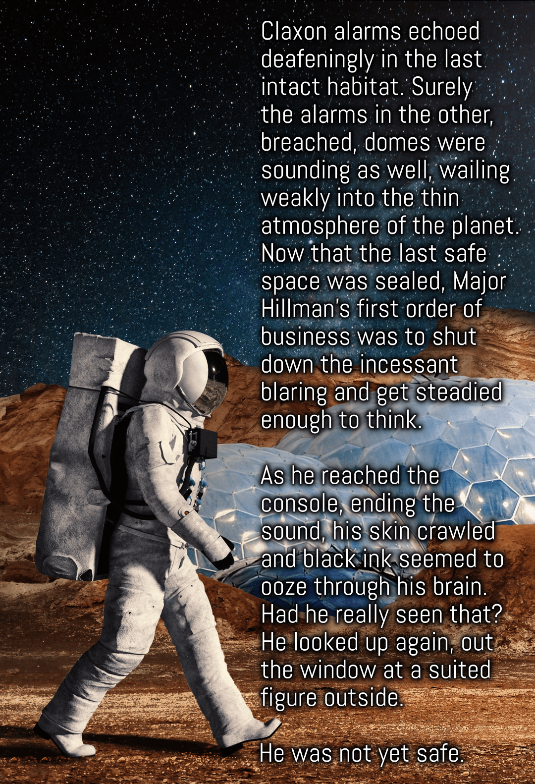 Claxon alarms echoed deafeningly in the last intact habitat. Surely the alarms in the other, breached, domes were sounding as well, wailing weakly into the thin atmosphere of the planet. Now that the last safe space was sealed, Major Hillman’s first order of business was to shut down the incessant blaring and get steadied enough to think.