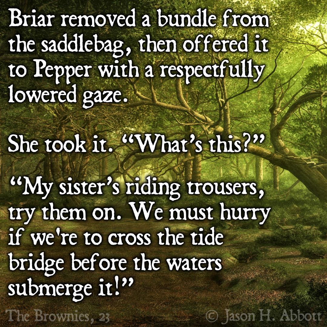 “My sister’s riding trousers, try them on. We must hurry if we’re to cross the tide bridge before the waters submerge it!”