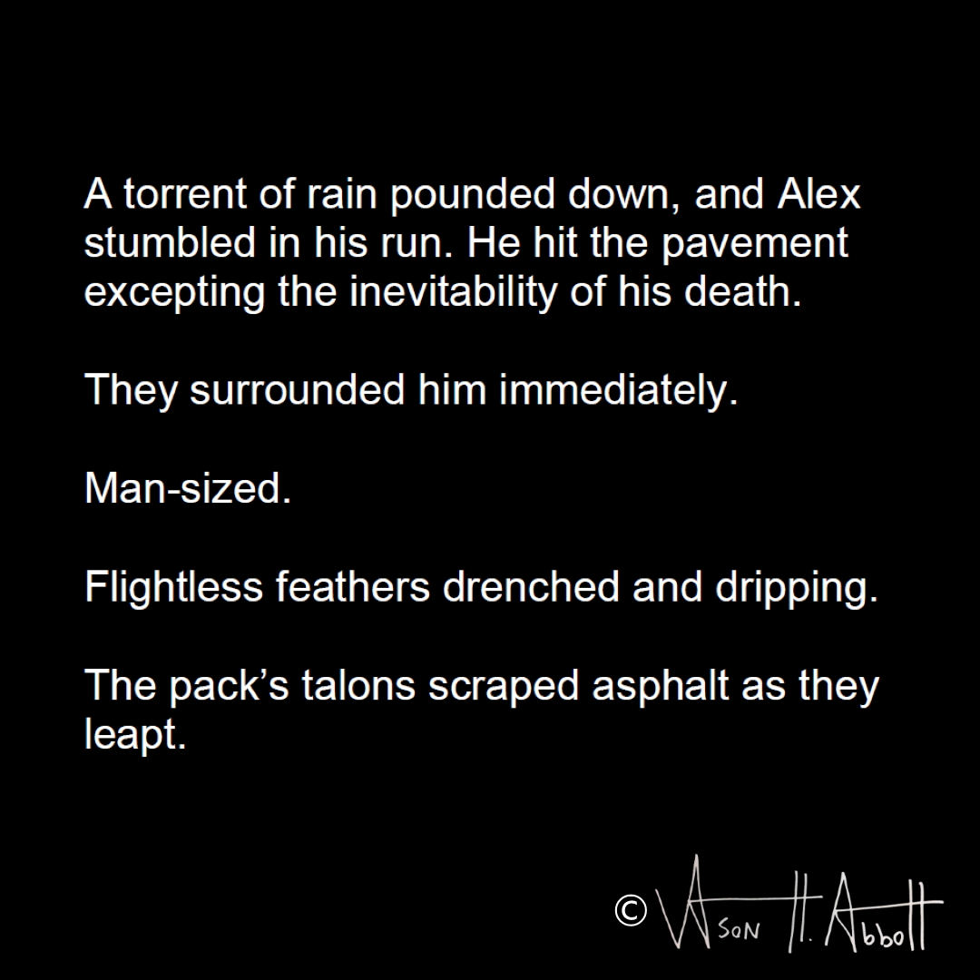 A torrent of rain pounded down, and Alex stumbled in his run. He hit the pavement excepting the inevitability of his death.