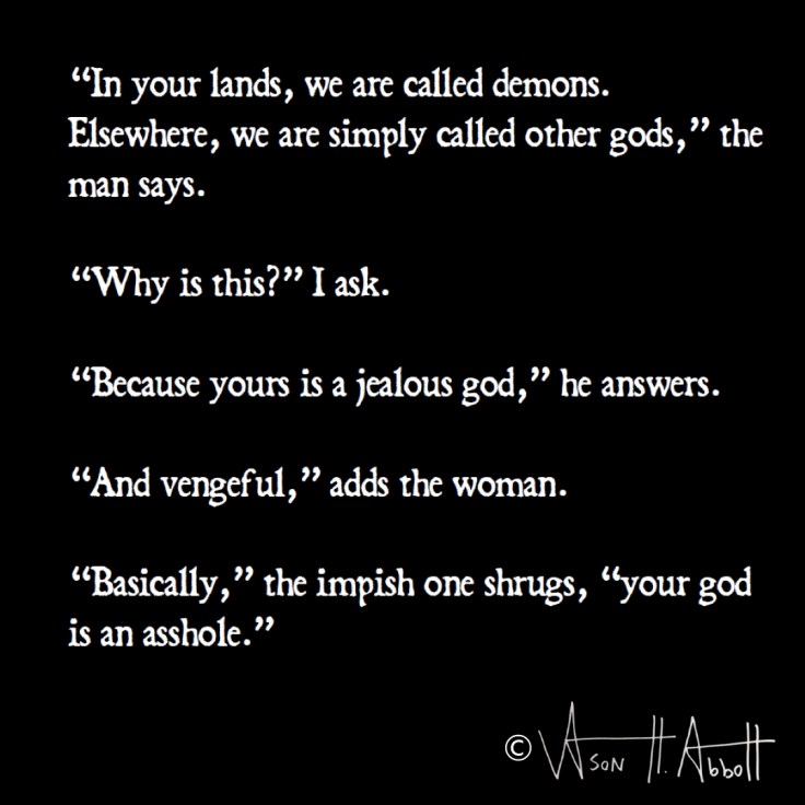 “Basically,” the impish one shrugs, “your god is an asshole.”