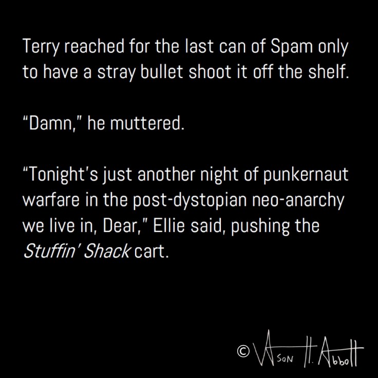 “Tonight’s just another night of punkernaut warfare in the post-dystopian neo-anarchy we live in, Dear,” Ellie said, pushing the Stuffin’ Shack cart.