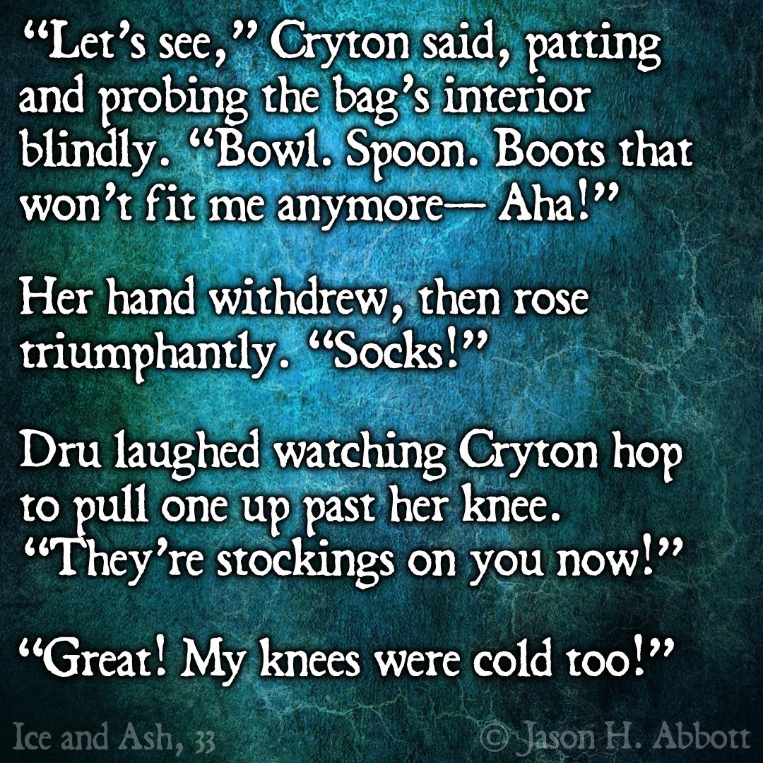 “Let’s see,” Cryton said, patting and probing the bag’s interior blindly. “Bowl. Spoon. Boots that won’t fit me anymore— Aha!”
