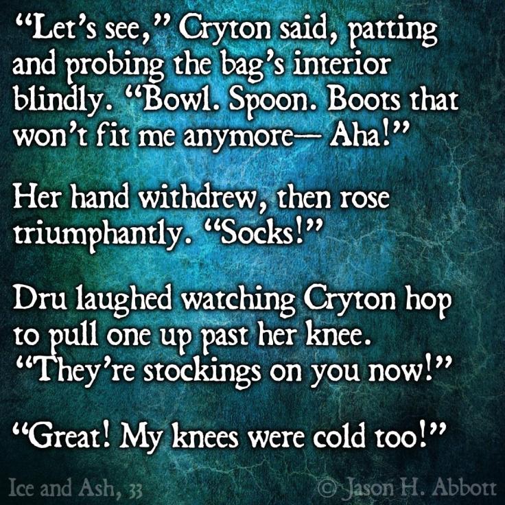 Dru laughed watching Cryton hop to pull one up past her knee. “They’re stockings on you now!”