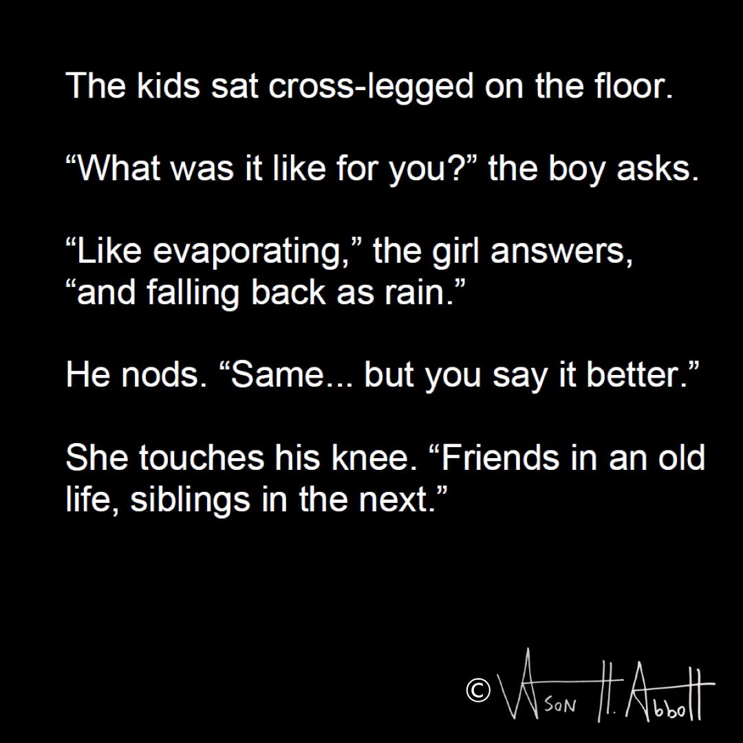 She touches his knee. “Friends in an old life, siblings in the next.”