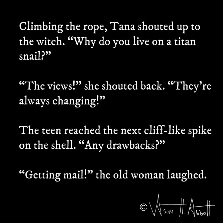 Climbing the rope, Tana shouted up to the witch. “Why do you live on a titan snail?”