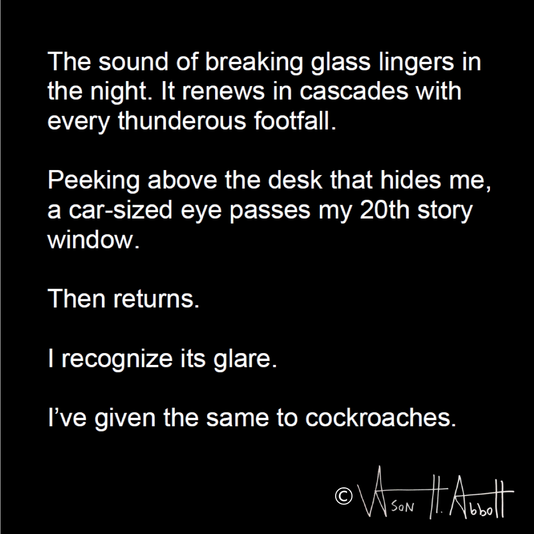 The sound of breaking glass lingers in the night. It renews in cascades with every thunderous footfall.