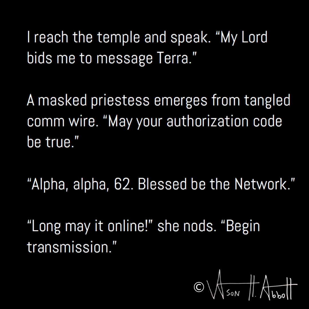A masked priestess emerges from tangled comm wire. “May your authorization code be true.”