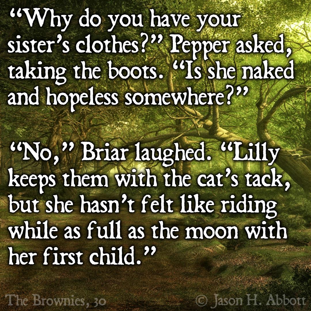 “Why do you have your sister’s clothes?” Pepper asked, taking the boots. “Is she naked and hopeless somewhere?”