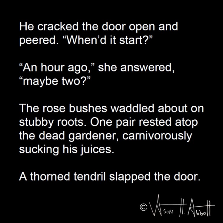 The rose bushes waddled about on stubby roots. One pair rested atop the dead gardener, carnivorously sucking his juices.
