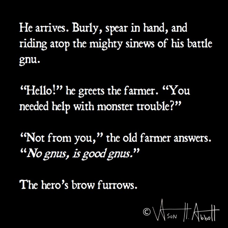 “Not from you,” the old farmer answers. “No gnus, is good gnus.”