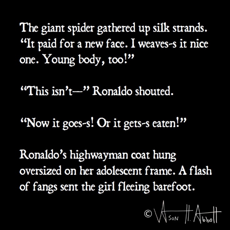 The giant spider gathered up silk strands. “It paid for a new face. I weaves-s it nice one. Young body, too!”