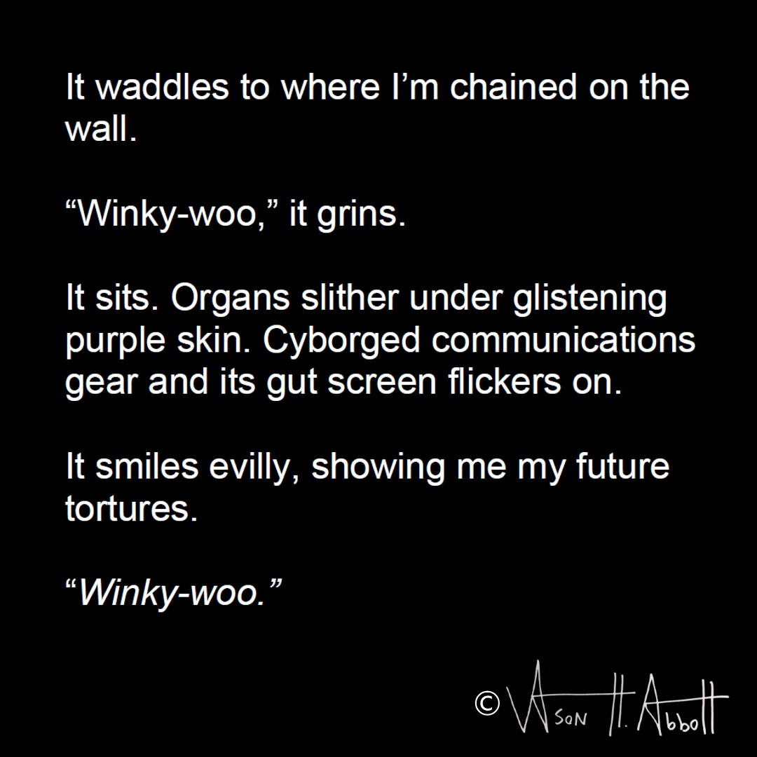 It sits. Organs slither under glistening purple skin. Cyborged communications gear and its gut screen flickers on.
