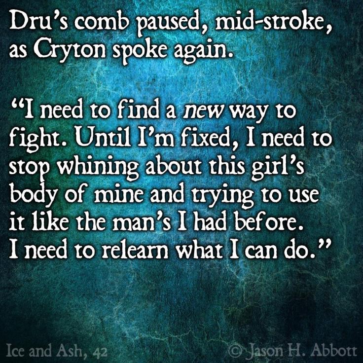 “I need to find a new way to fight. Until I’m fixed, I need to stop whining about this girl’s body of mine and trying to use it like the man’s I had before. I need to relearn what I can do.”