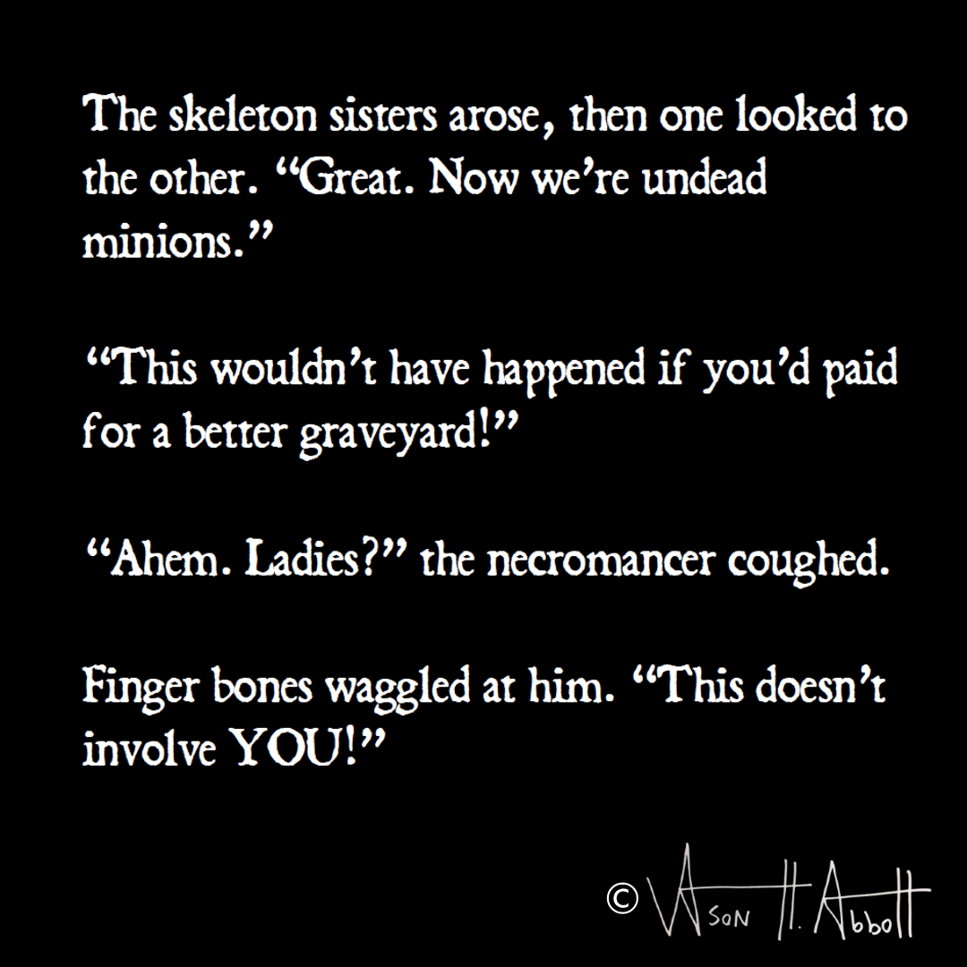 The skeleton sisters arose, then one looked to the other. “Great. Now we’re undead minions.”