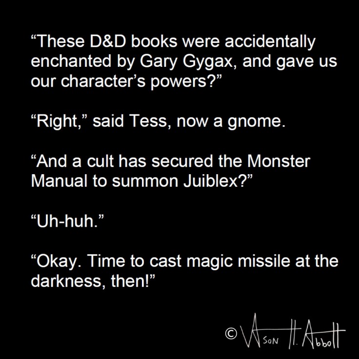 “These D&D books were accidentally enchanted by Gary Gygax, and gave us our character’s powers?”