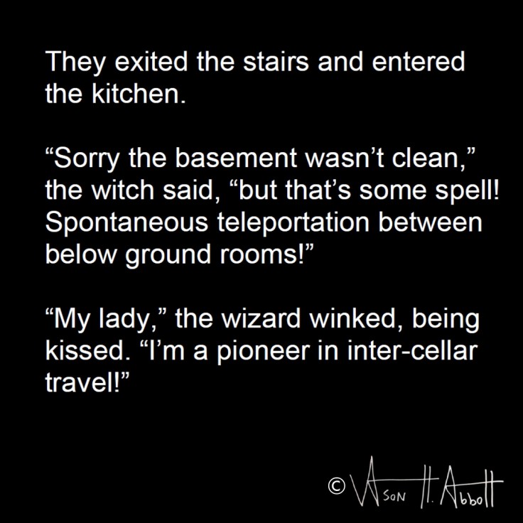 “Sorry the basement wasn’t clean,” the witch said, “but that’s some spell! Spontaneous teleportation between below ground rooms!”