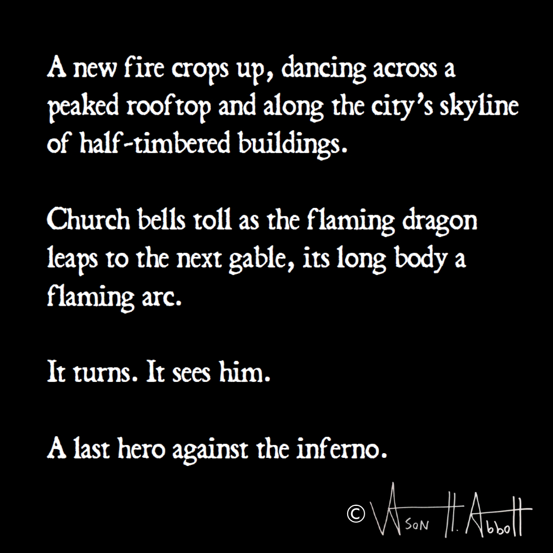 Church bells toll as the flaming dragon leaps to the next gable, its long body a flaming arc.