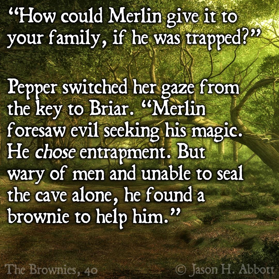 Pepper switched her gaze from the key to Briar. “Merlin foresaw evil seeking his magic. He chose entrapment. But wary of men and unable to seal the cave alone, he found a brownie to help him.”