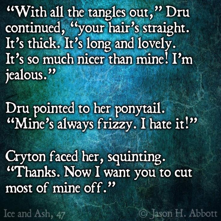 “With all the tangles out,” Dru continued, “your hair’s straight. It’s thick. It’s long and lovely. It’s so much nicer than mine! I’m jealous.”