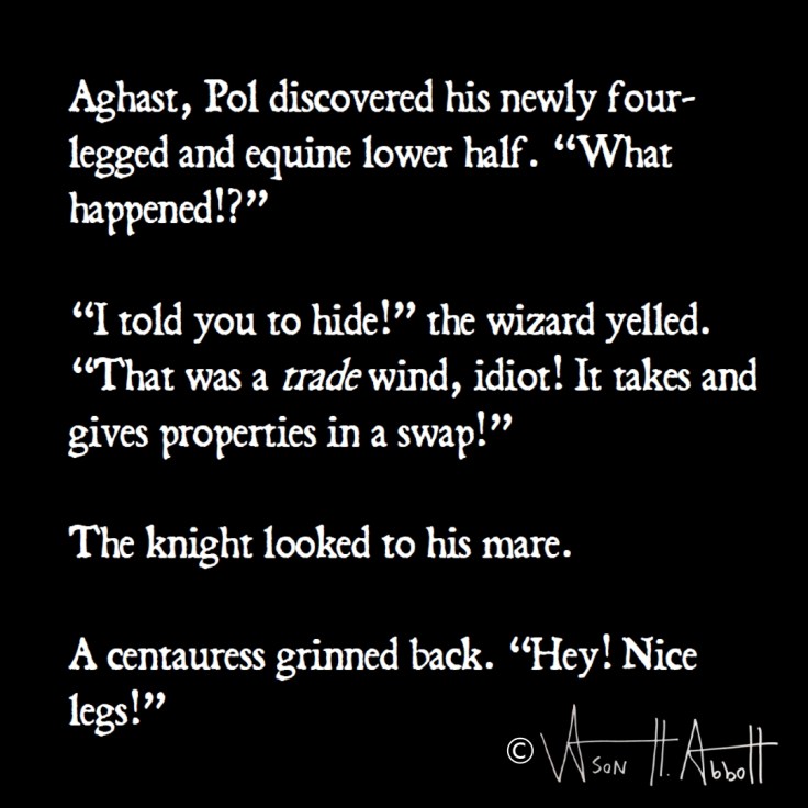 Aghast, Pol discovered his newly four-legged and equine lower half. “What happened!?”