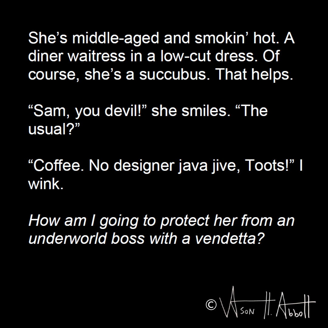 She’s middle-aged and smokin’ hot. A diner waitress in a low-cut dress. Of course, she’s a succubus. That helps.