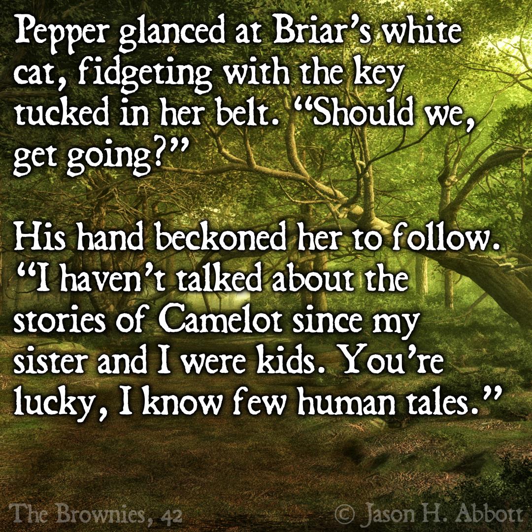His hand beckoned her to follow. “I haven’t talked about the stories of Camelot since my sister and I were kids. You’re lucky, I know few human tales.”