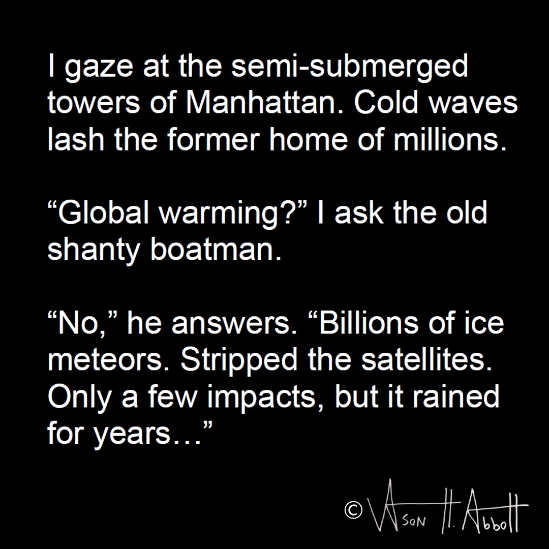 I gaze at the semi-submerged towers of Manhattan. Cold waves lash the former home of millions.
