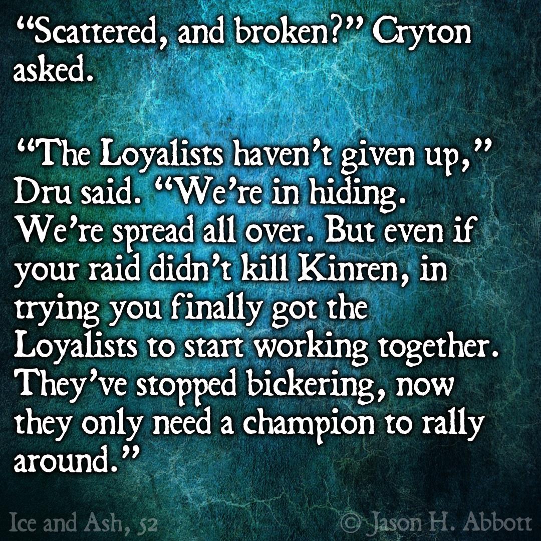“The Loyalists haven’t given up,” Dru said. “We’re in hiding. We’re spread all over. But even if your raid didn’t kill Kinren, in trying you finally got the Loyalists to start working together. They’ve stopped bickering, now they only need a champion to rally around.”