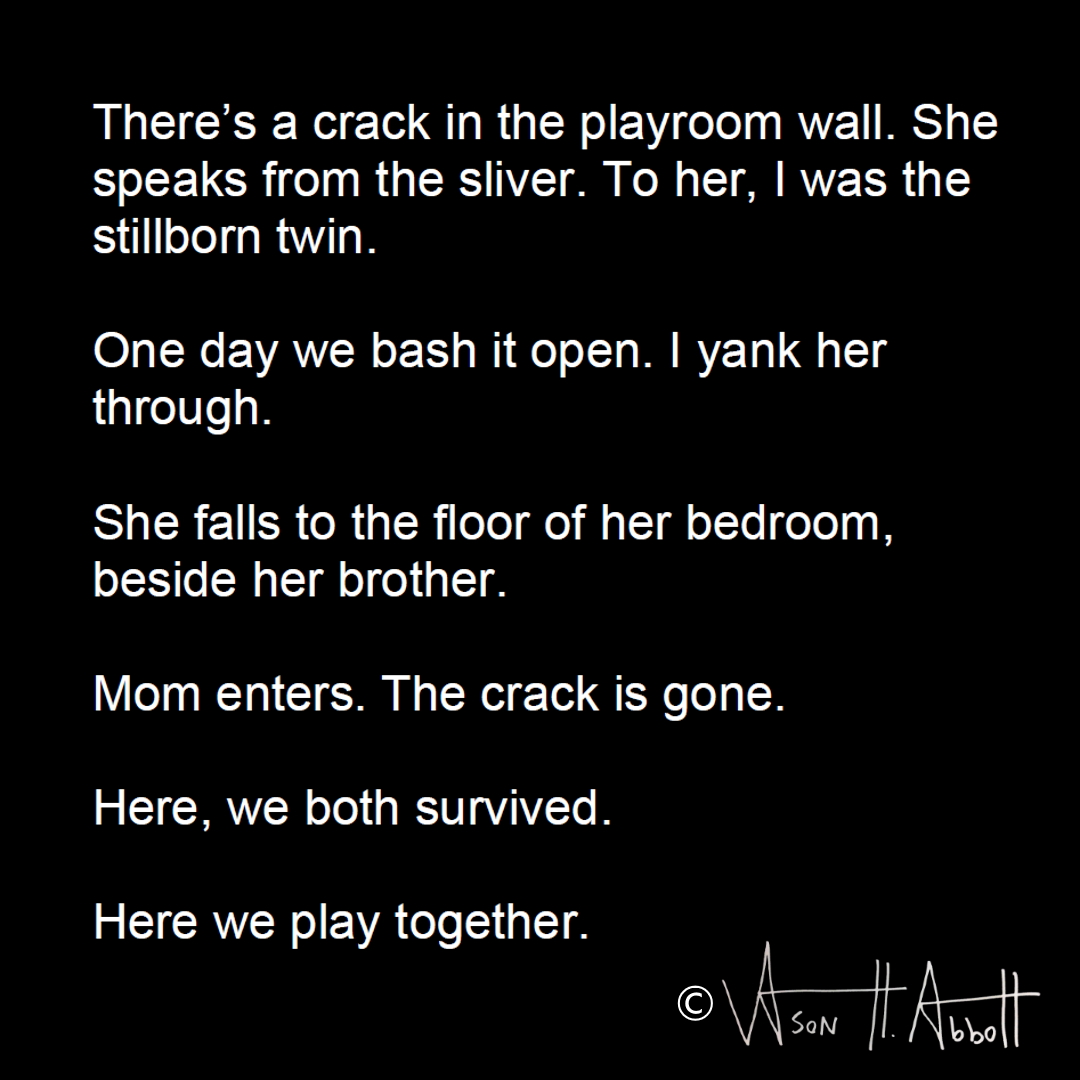 There’s a crack in the playroom wall. She speaks from the sliver. To her, I was the stillborn twin.