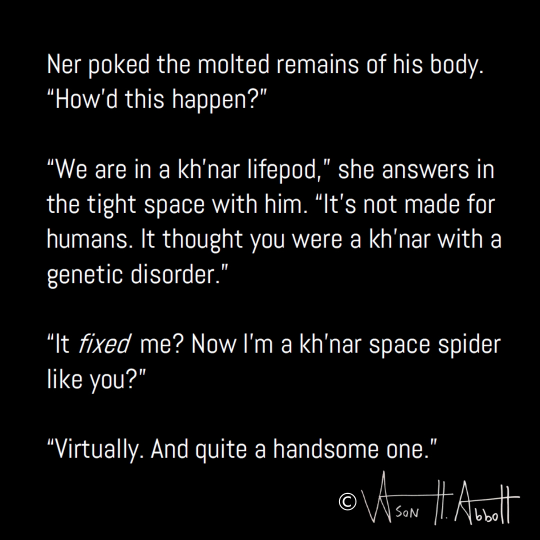 “We are in a kh’nar lifepod,” she answers in the tight space with him. “It’s not made for humans. It thought you were a kh’nar with a genetic disorder.”