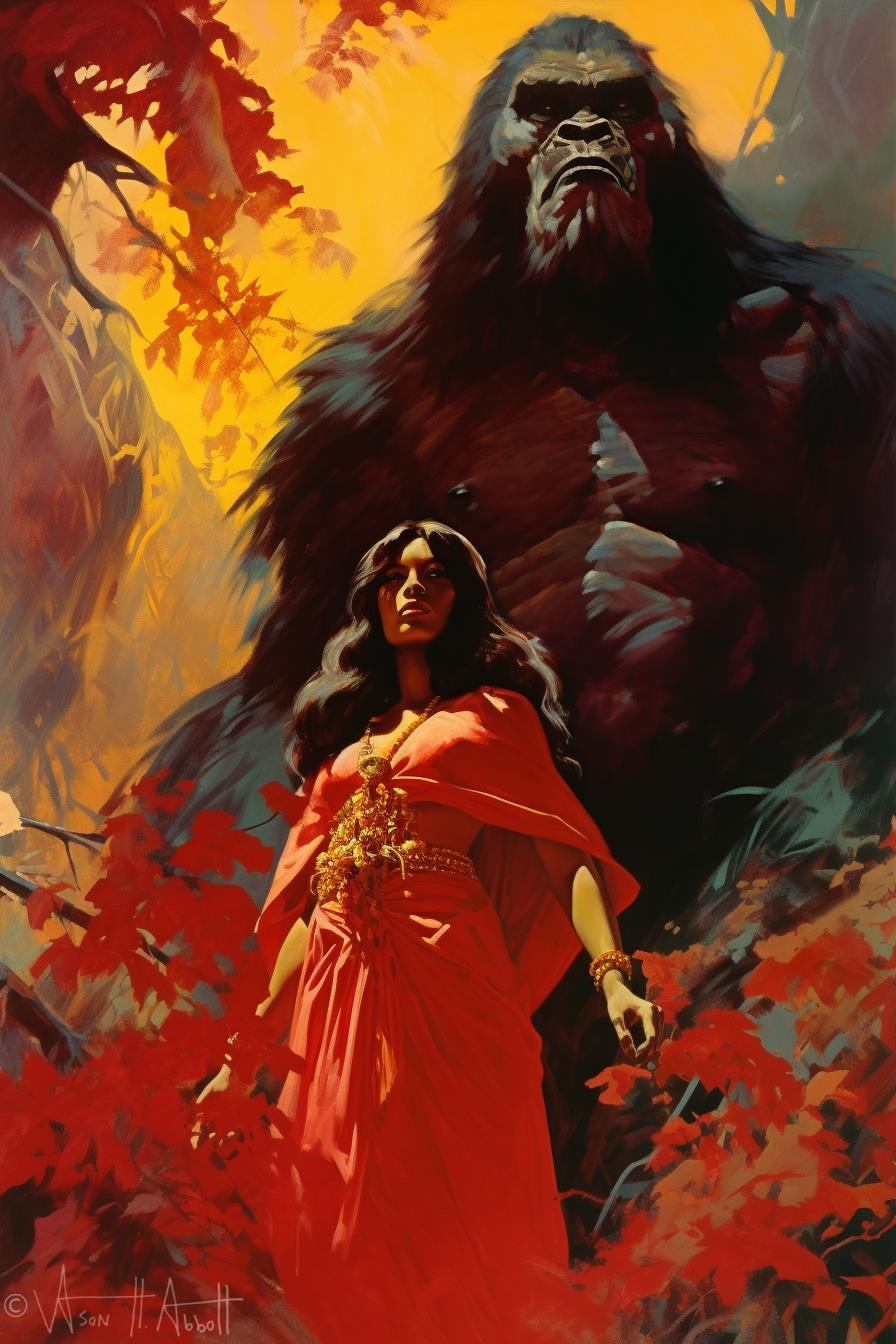 As the million strong army gathered in the cosmic valley, the High Priestess remained calm, floating dreamlike among the ochre clouds in her red dress.